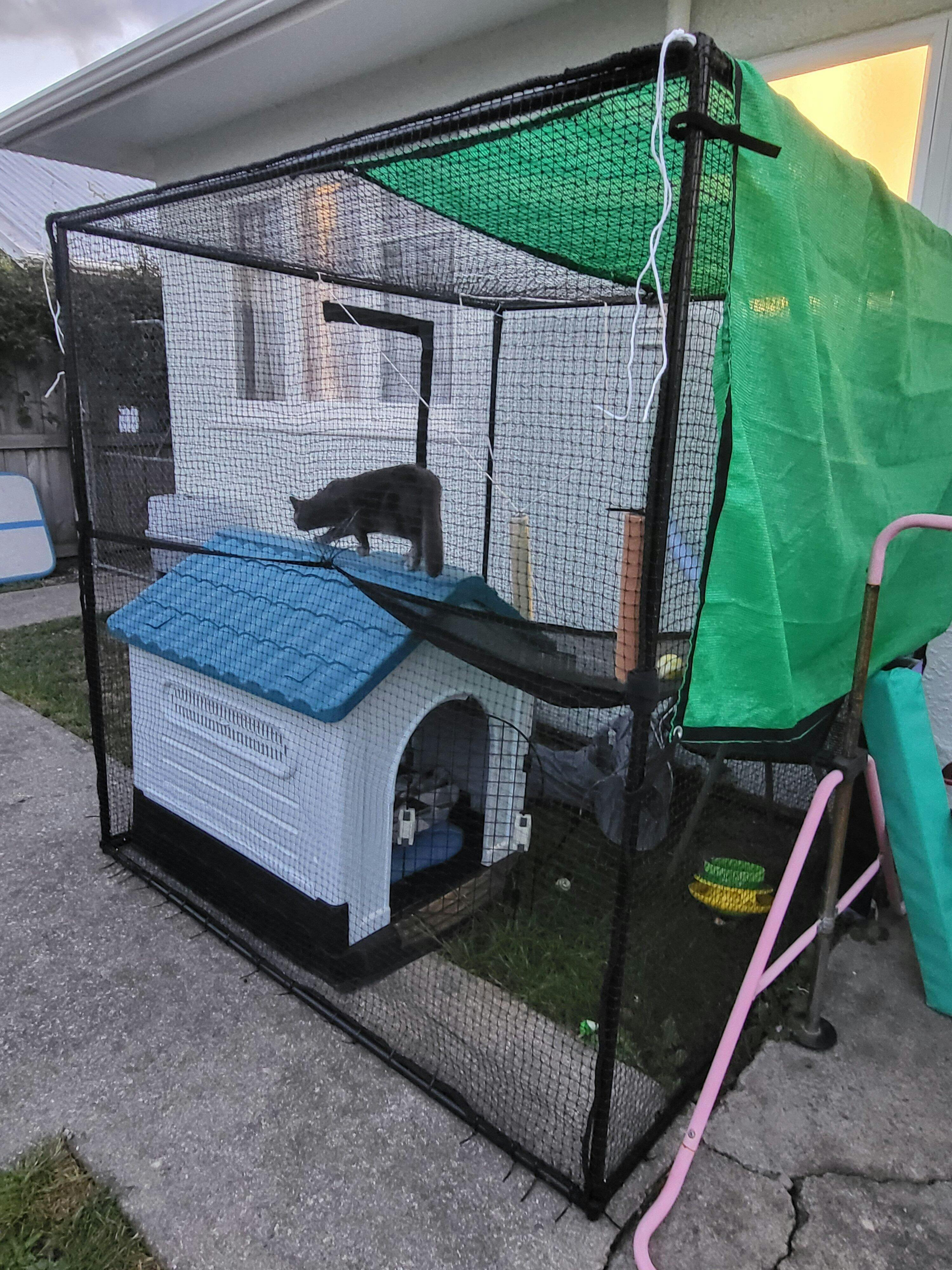 I bought a small-ish ‘hutch’ and run to begin with, which was okay enough when I had one cat. I now have 3. I upgraded to a ‘chicken coop’ which was a lot bigger, but the chicken wire was not a good idea. With all that money spent I could have bought this! Doesn’t matter, they have one now and they love it. Two of them argue over the hammock!