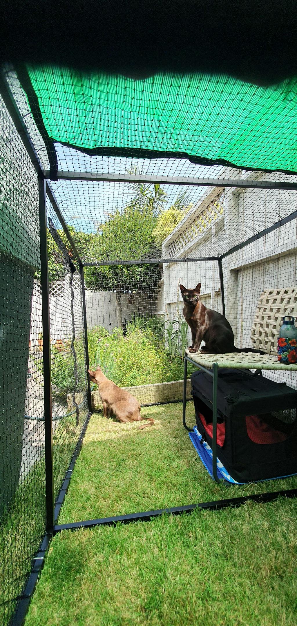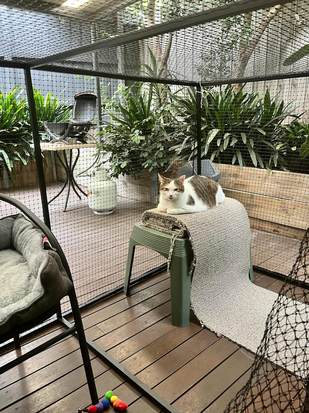 Safety: Due to the size of the netting squares, Catnets recommend kittens (6 months and under) should not be left unattended for prolonged periods within the enclosure. In regards to cat enclosures safety in general, it is advised that all netting is installed as taut as practically possible.
